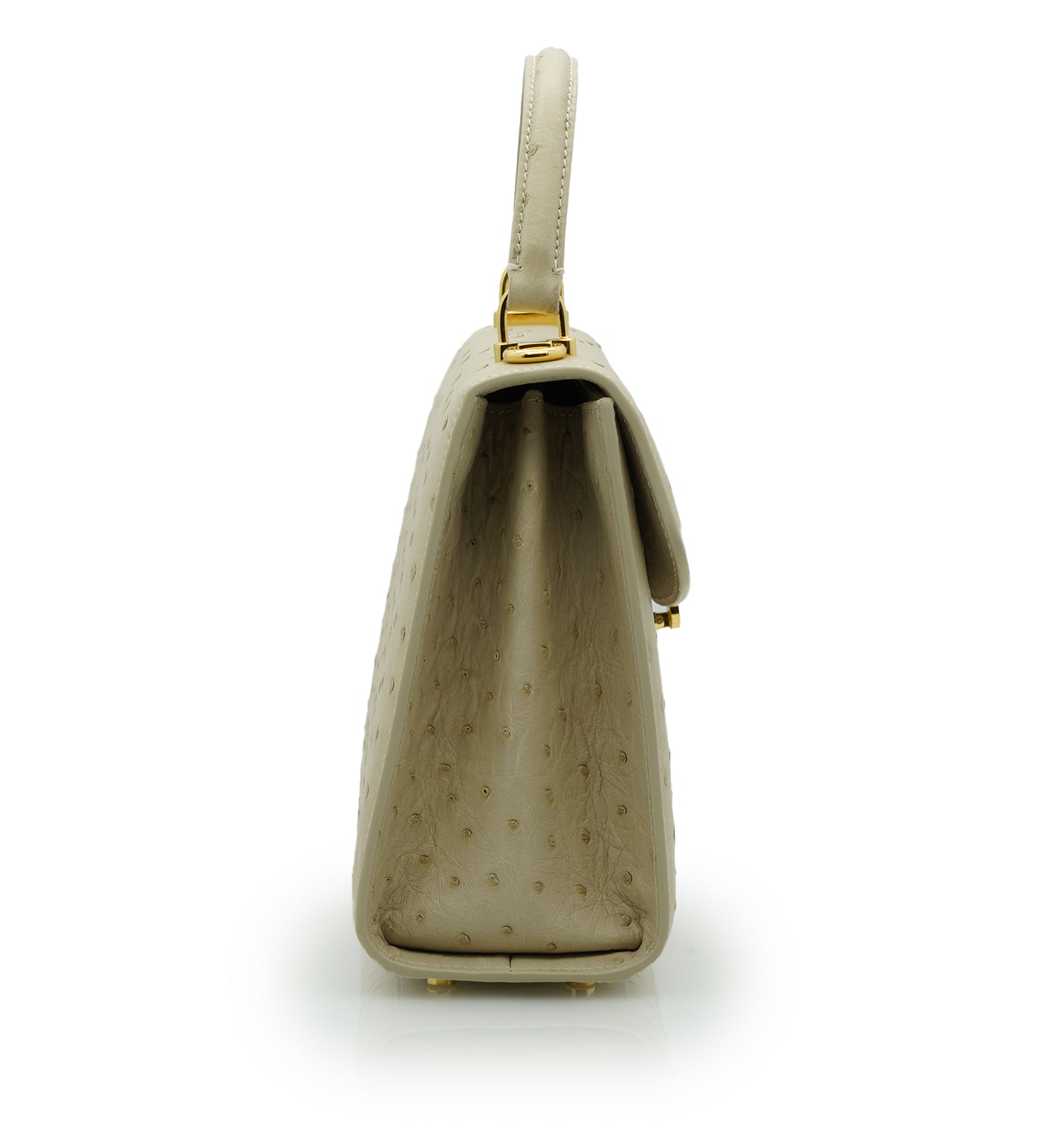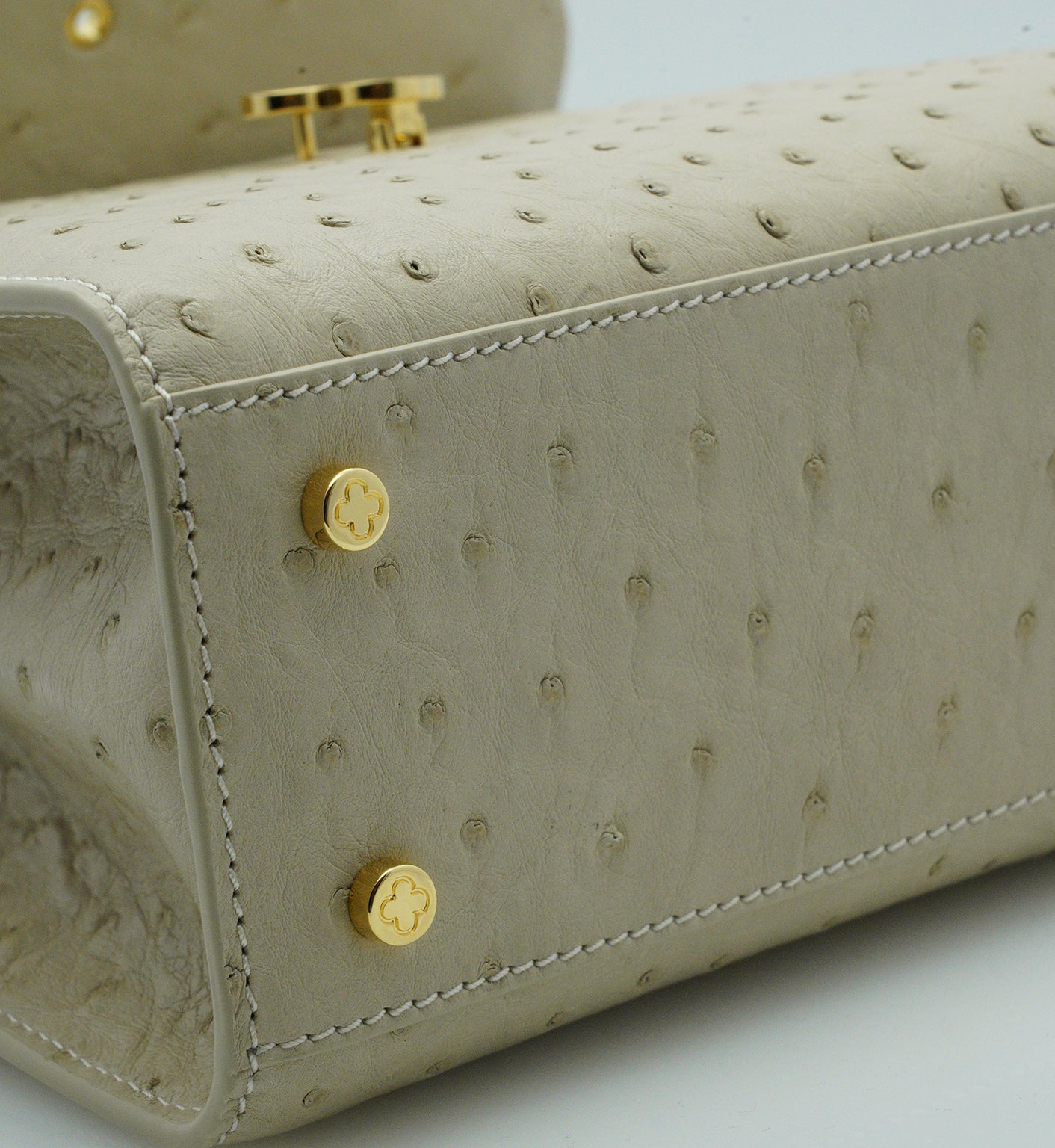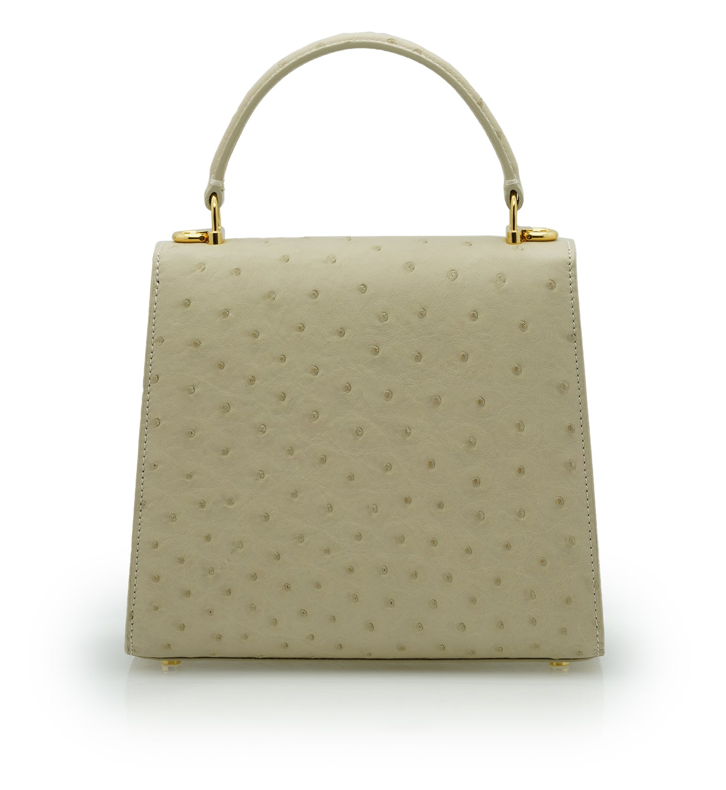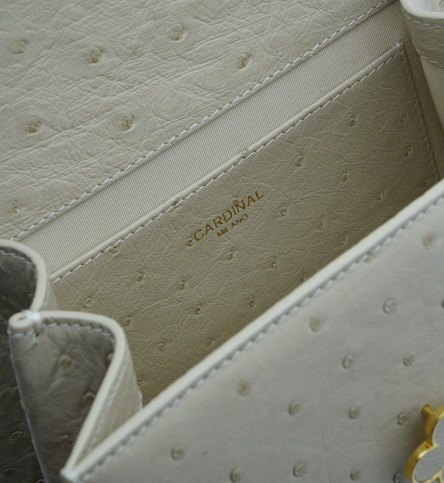 Cardinal signature Tiffany top handle bag is perfect accessory to wear cross seasons. This bag in medium size is perfect for daily use in any occasion, you can meeting with friends, walking around the city, traveling, shopping while feel light and fashionable. This timeless bag has been realized in Milano by experted artisans in clean elegant shape. It is handcrafted from genuine ostrich leather in elegant beige color, detailed with Cardinal brand flower clip lock. The top handle is comfortable for hand or elbow carry and a removable strap for over-the-shoulder wear. The bag is roomy enough for your essentials like small wallet, keys and make up. A special Cardinal clasp keeps your essentials safe, there is one internal pocket.