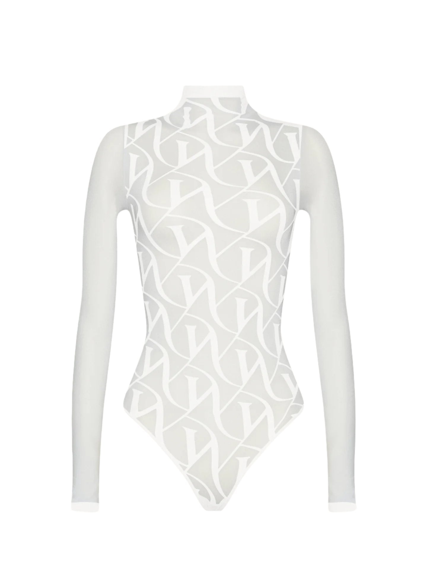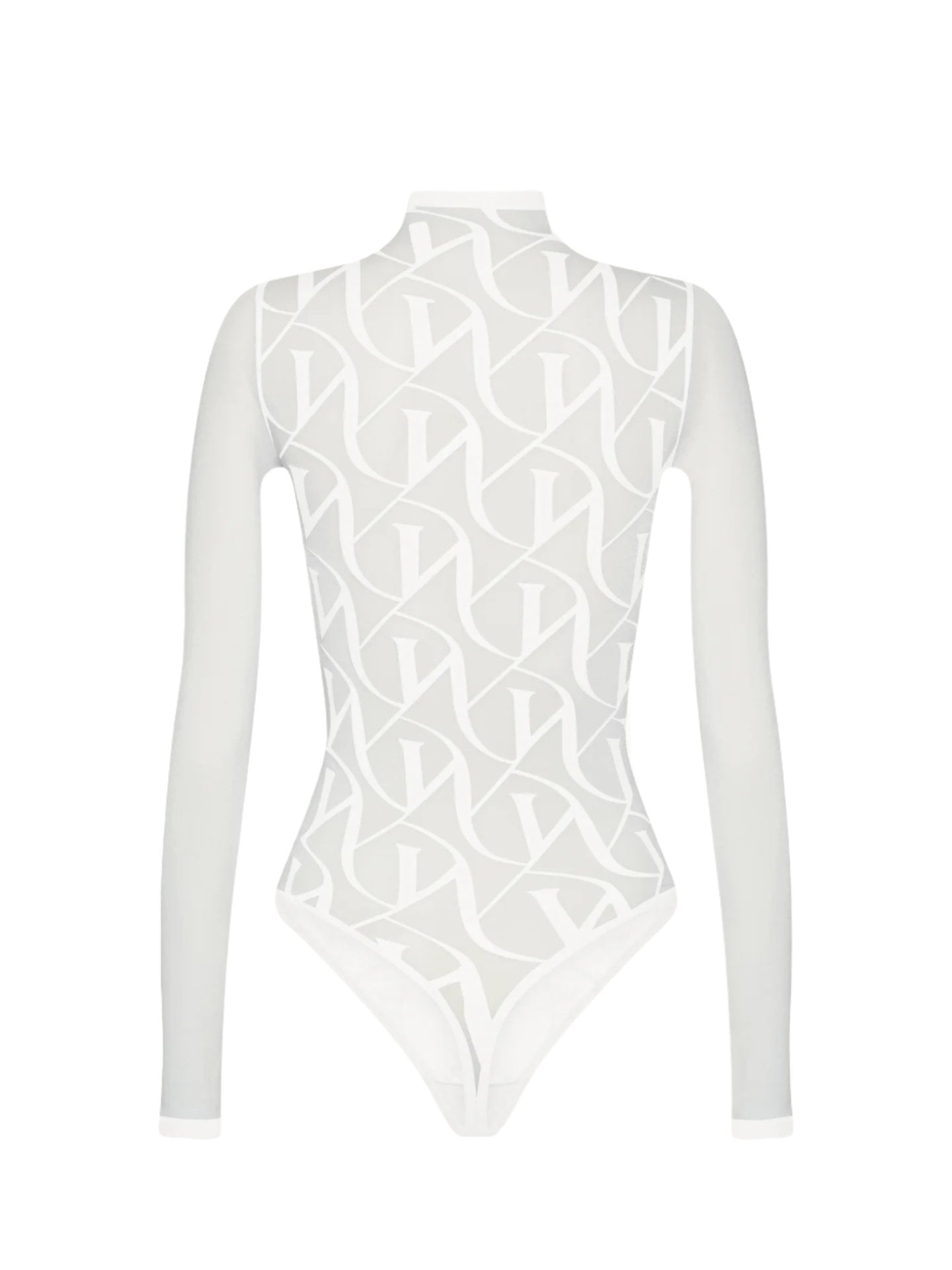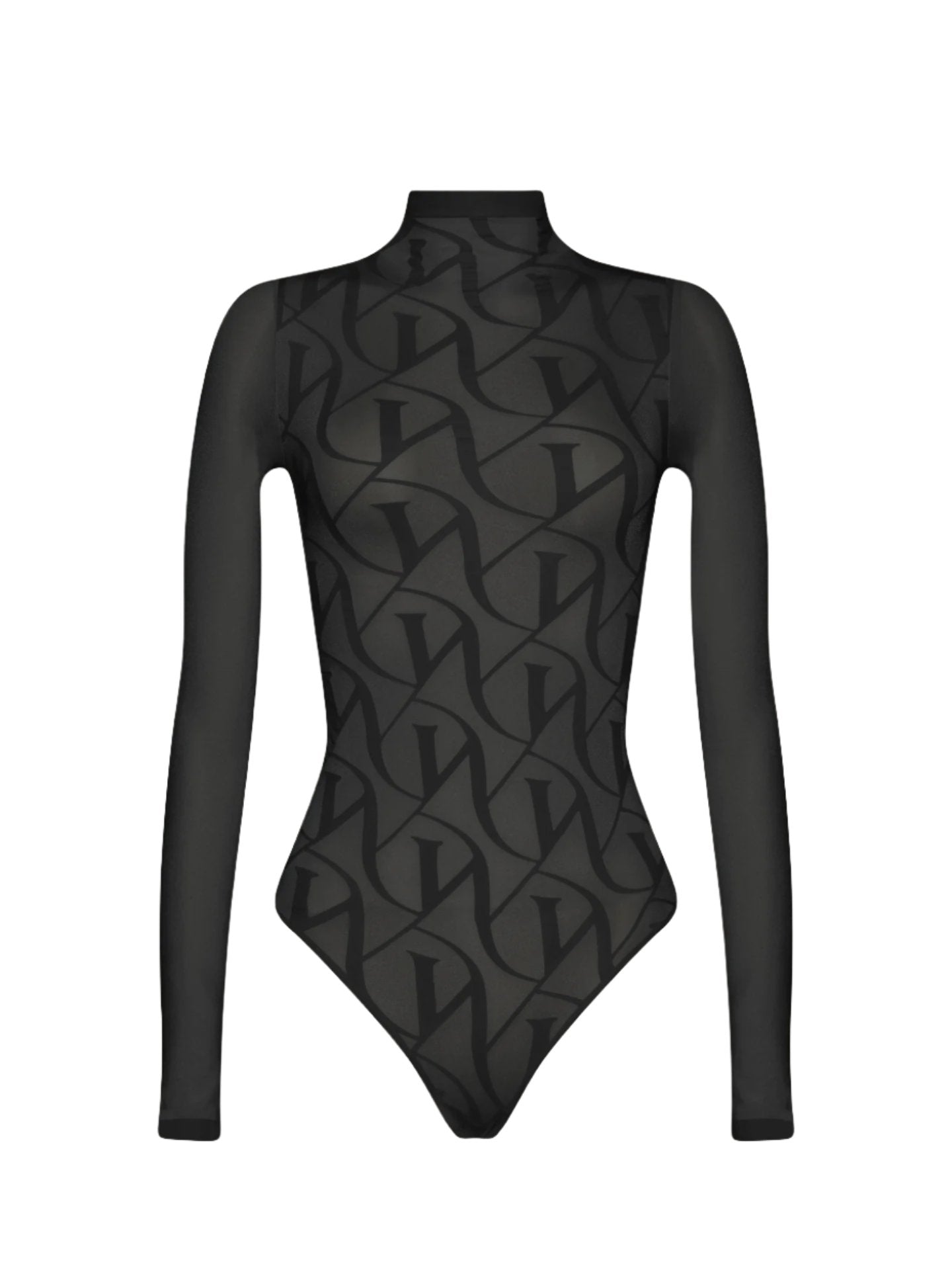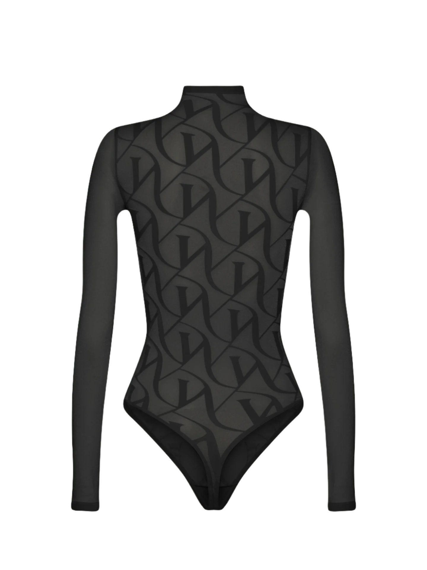 embedded into the sheer-opaque circular knit bodysuit. The mix of motifs